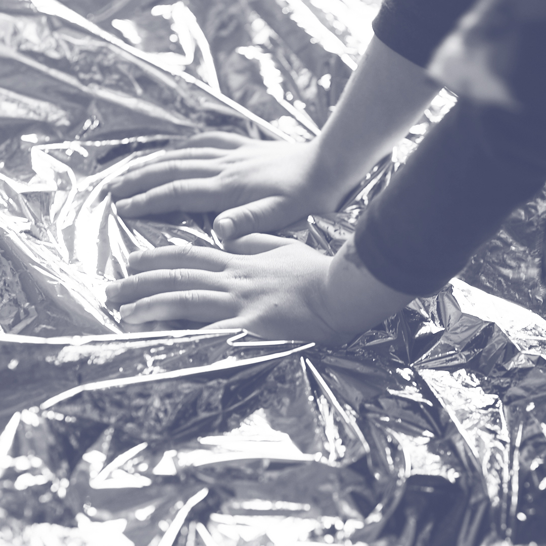 licht, water, klei, doek en touw. Ze maken geluid met papier, dansen met water